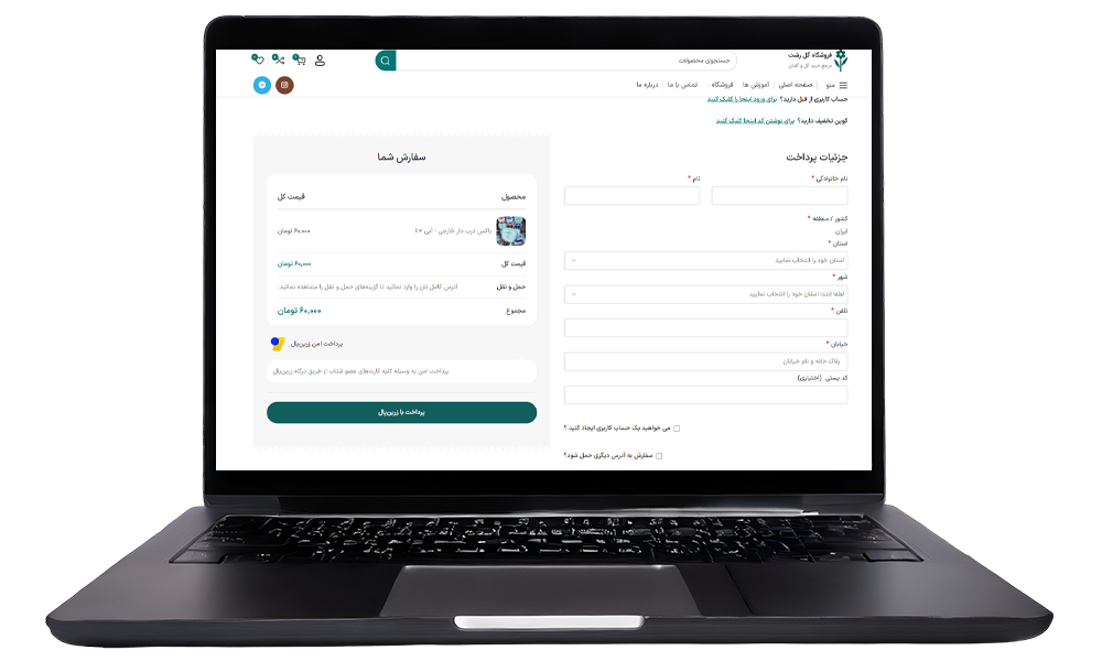 بعد از انتقال به صفحه تسویه حساب لطفا تمامی فیلد های مورد نظر را با اطلاعات دقیق و صحیح پر کنید و بعد از انتخاب روش حمل و نقل مدنظر و زدن تیک قوانین و مقررات و باقی تاییدیه های مورد نیاز بر روی دکمه پرداخت با زرین پال کلیک کنید و پرداخت خود را انجام تا سفارش شما بلافاصله از انبار برای ارسال آماده سازی شود.